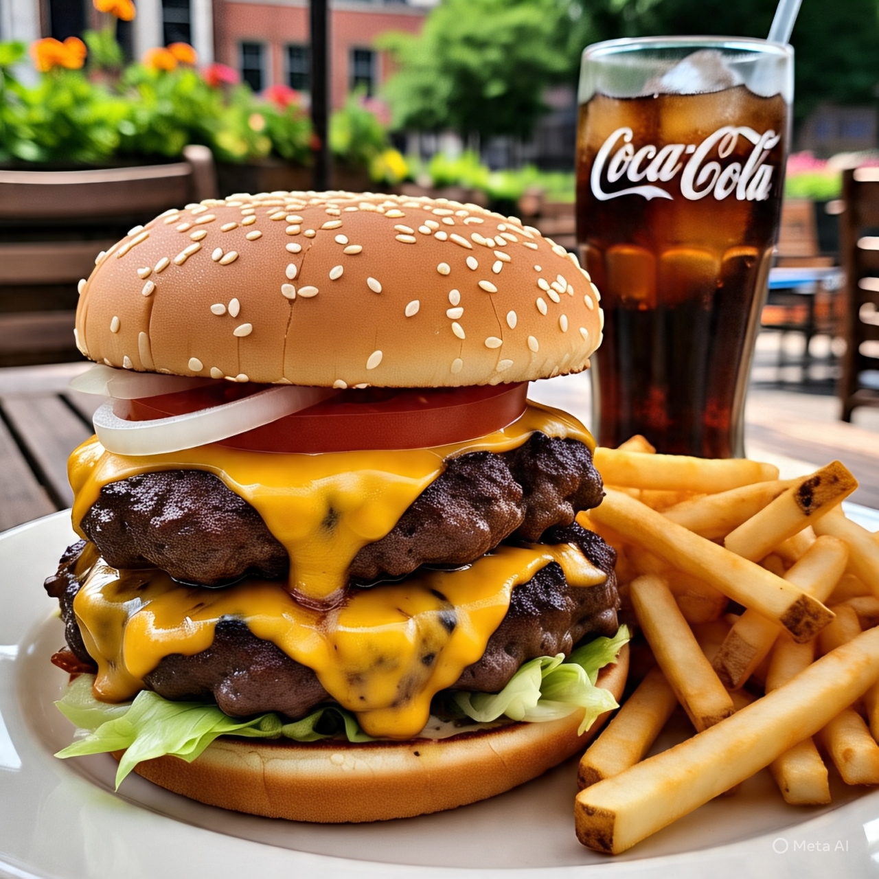 Pan de ajonjolí, carne de res de 120 g, queso cheddar, lechuga, tomate, cebolla y salsas de la casa, coca cola 250 ml y francesas.
