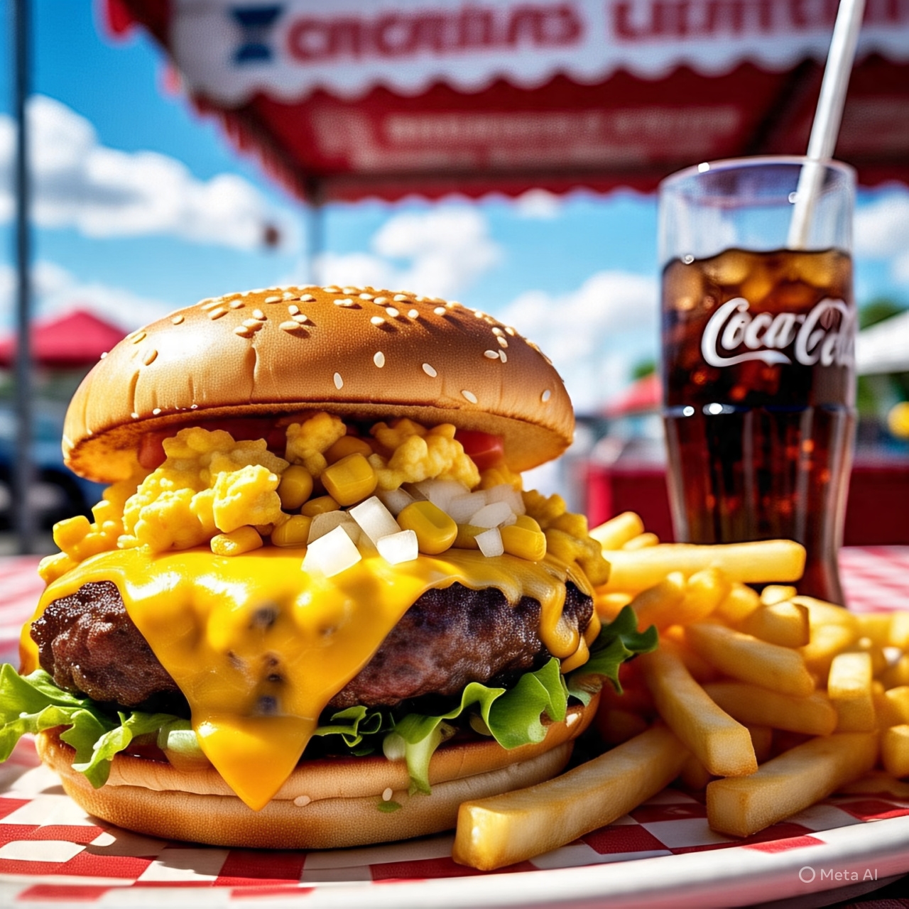 Pan de ajonjolí, carne de res de 120 g, queso cheddar, huevo revuelto con maíz tierno, lechuga, tomate, cebolla, salsas de la casa, coca cola 250 ml y francesa.