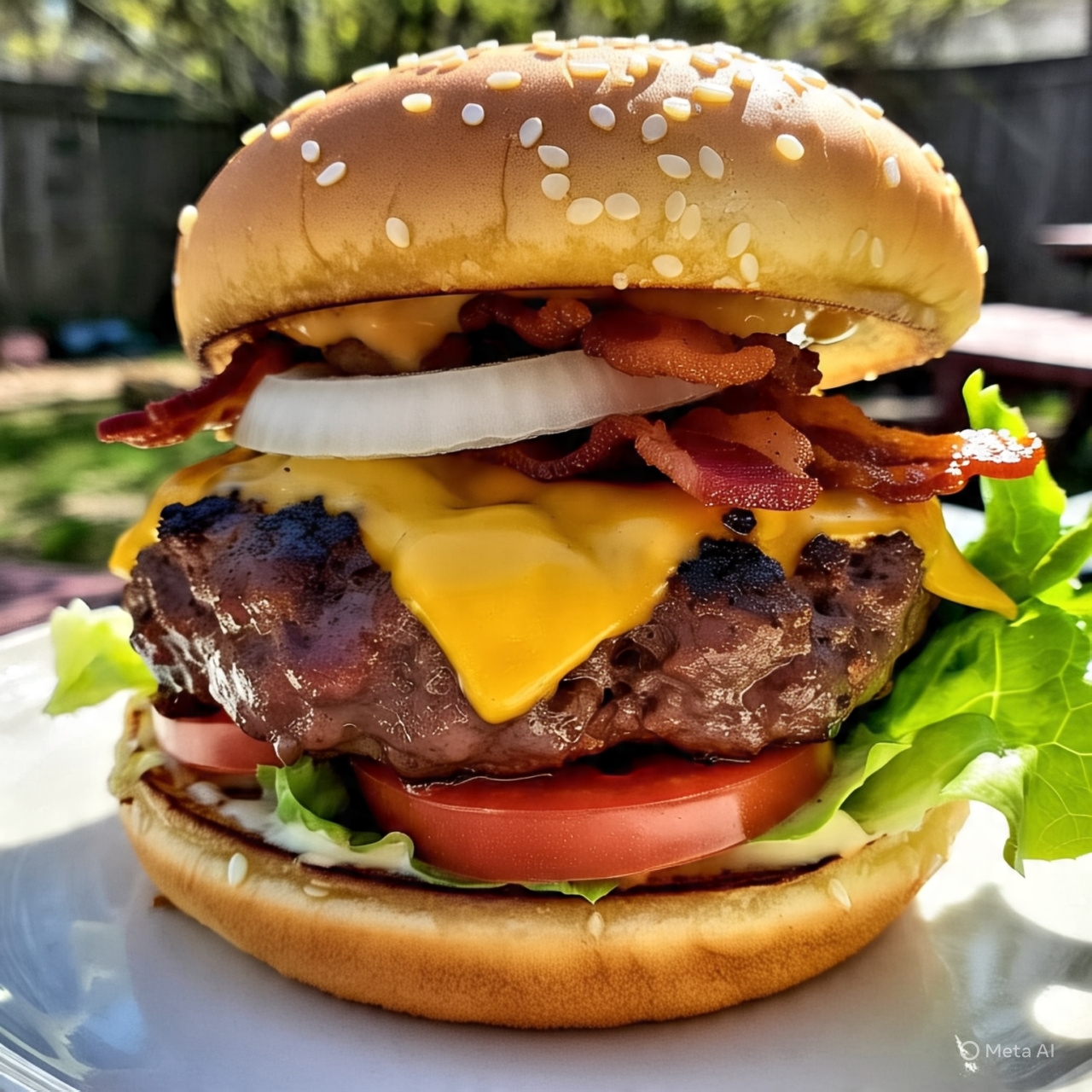 Pan de ajonjolí, queso cheddar, carne de res de 120 g, tocineta, lechuga, tomate, cebolla y salsas de la casa.