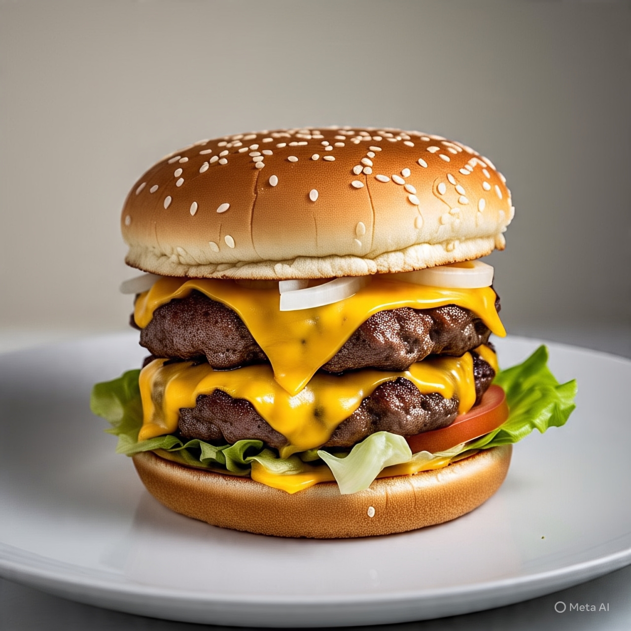 Pan de ajonjolí, doble queso cheddar, doble carne de res de 120 g, lechuga, tomate, cebolla y salsas de la casa.
