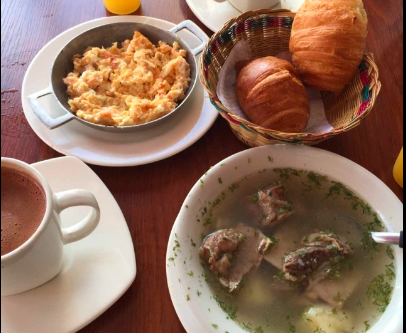Caldo de costilla acompañado de arroz, huevos rancheros, chocolate y pan