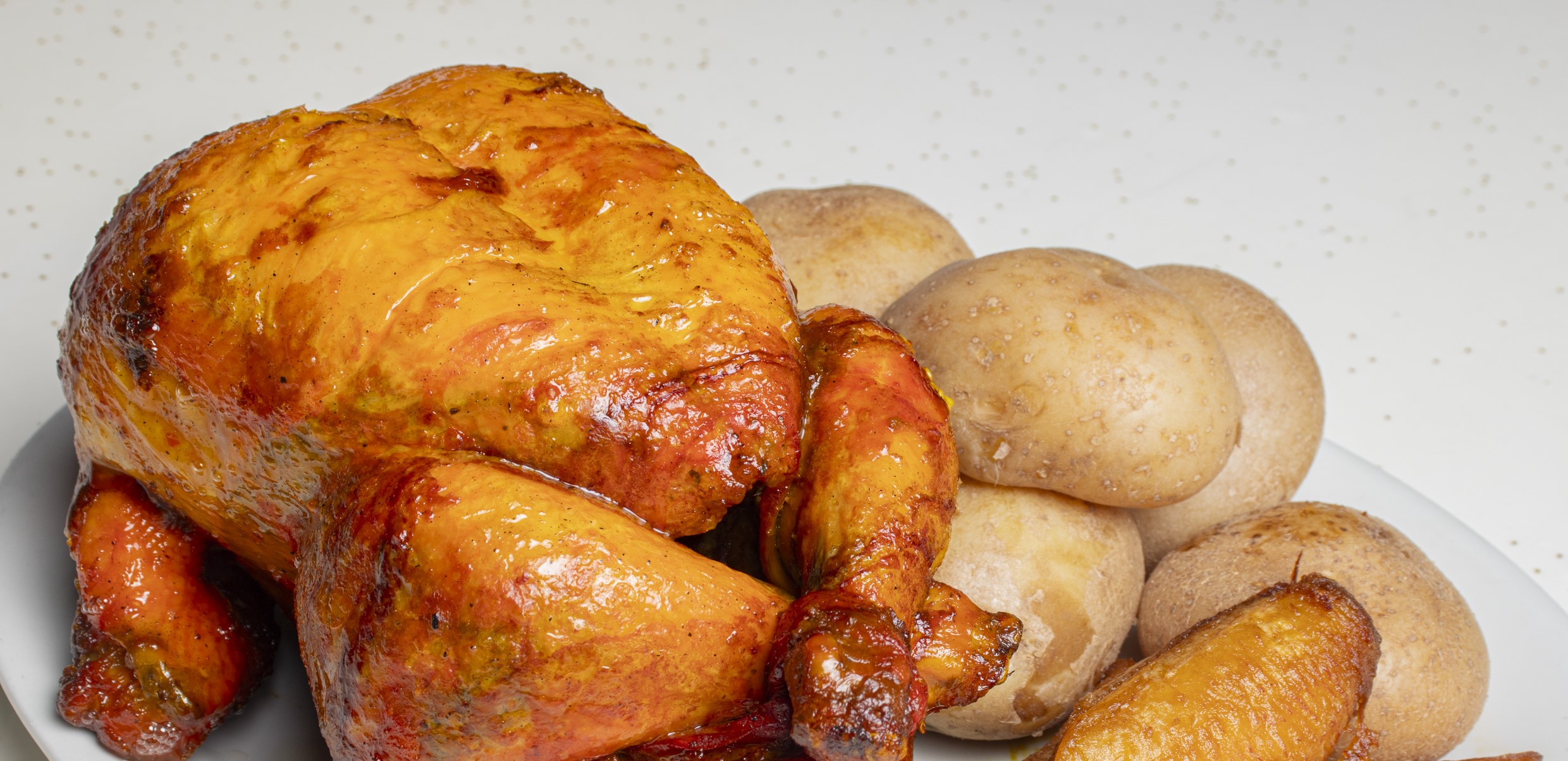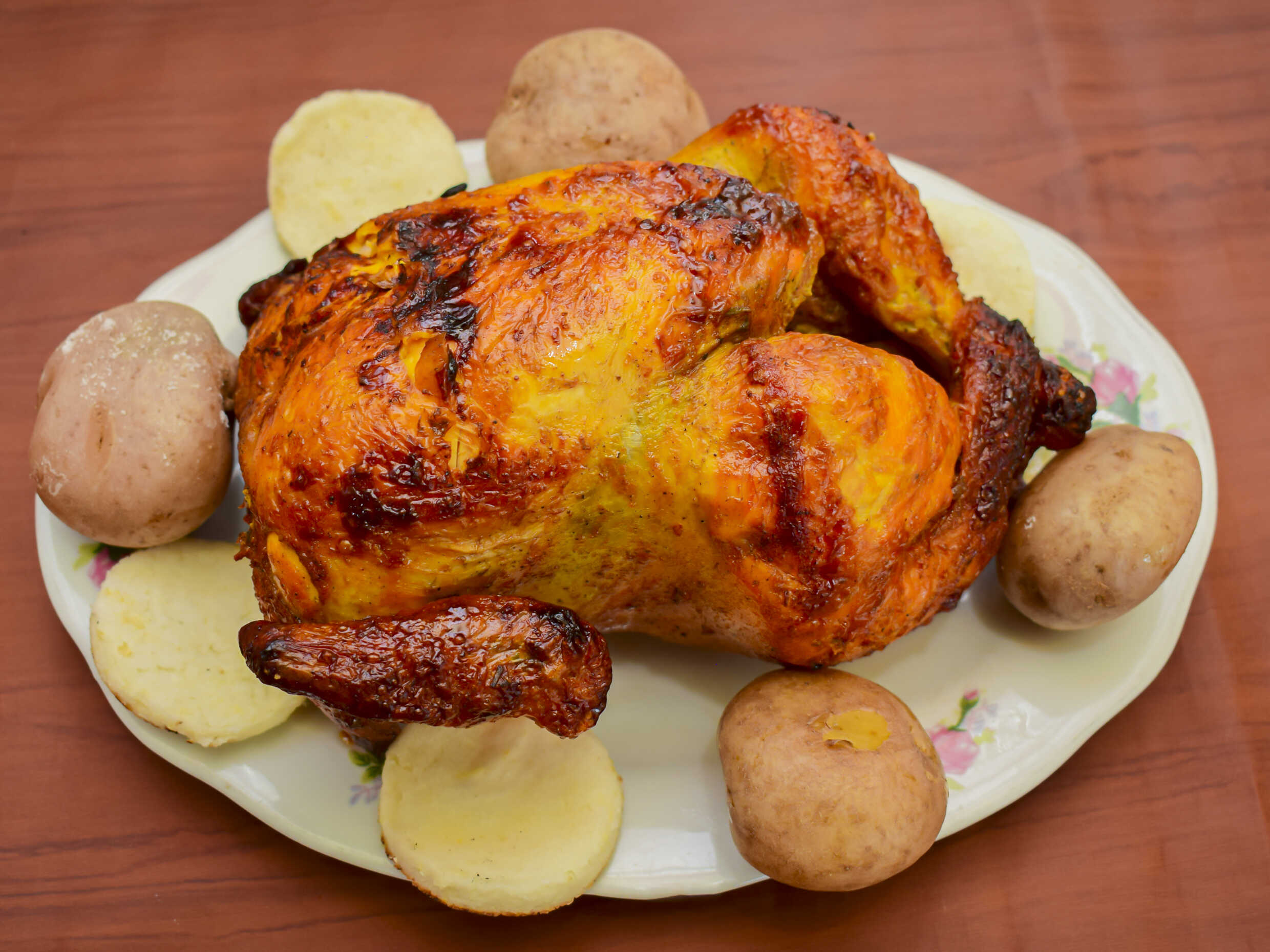 Un pollo asado: 8 presas de pollo acompañados de 4 papas saladas.