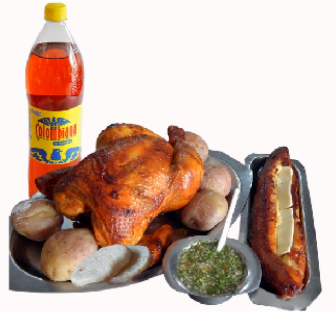 1 pollo + 1/2 pollo asado + papa + arepa + gaseosa 1.5
