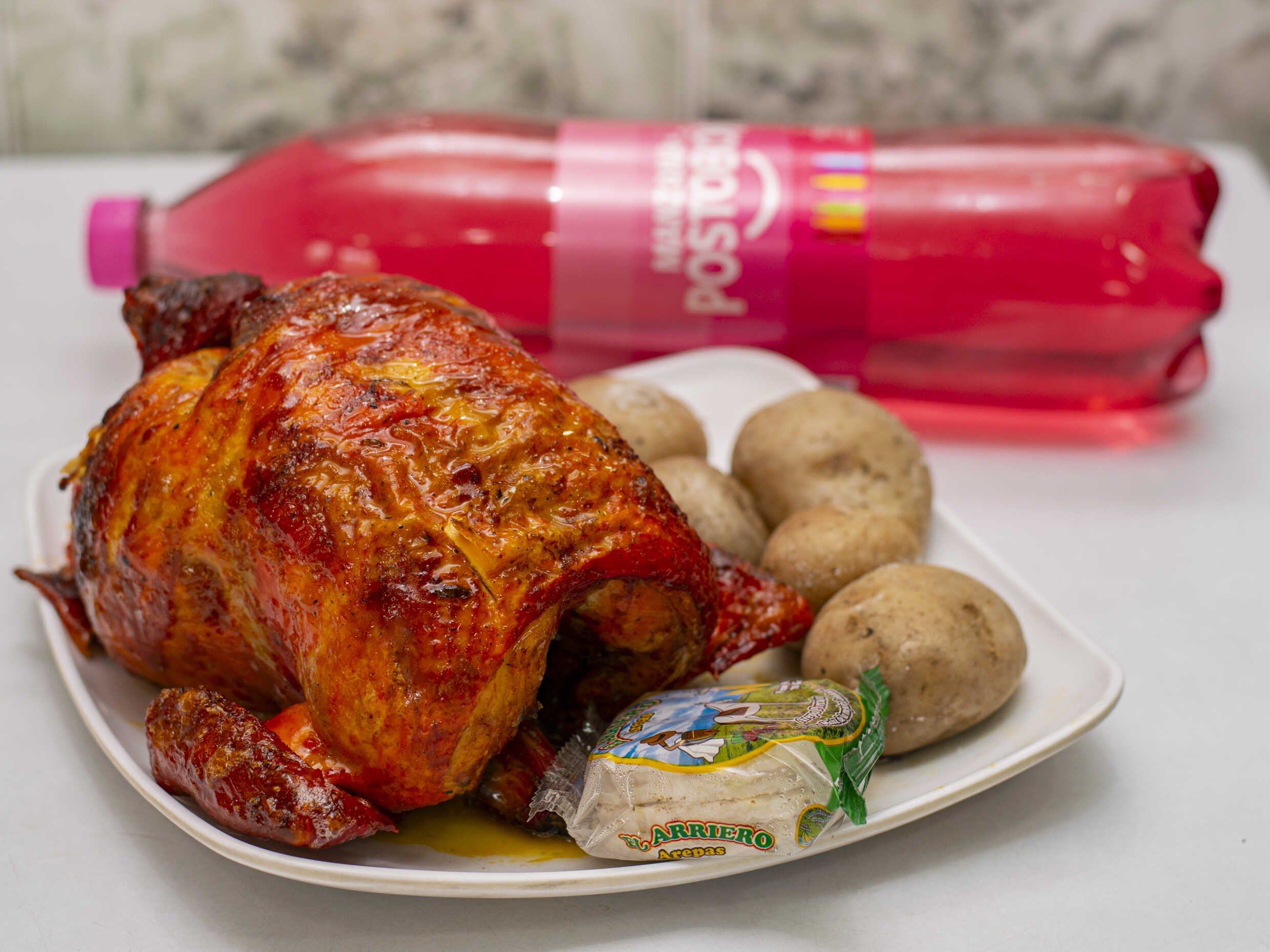 Medio Pollo Asado + Papas Cocidas + Porción Arepas + Gaseosa Postobón 1.5 L*1