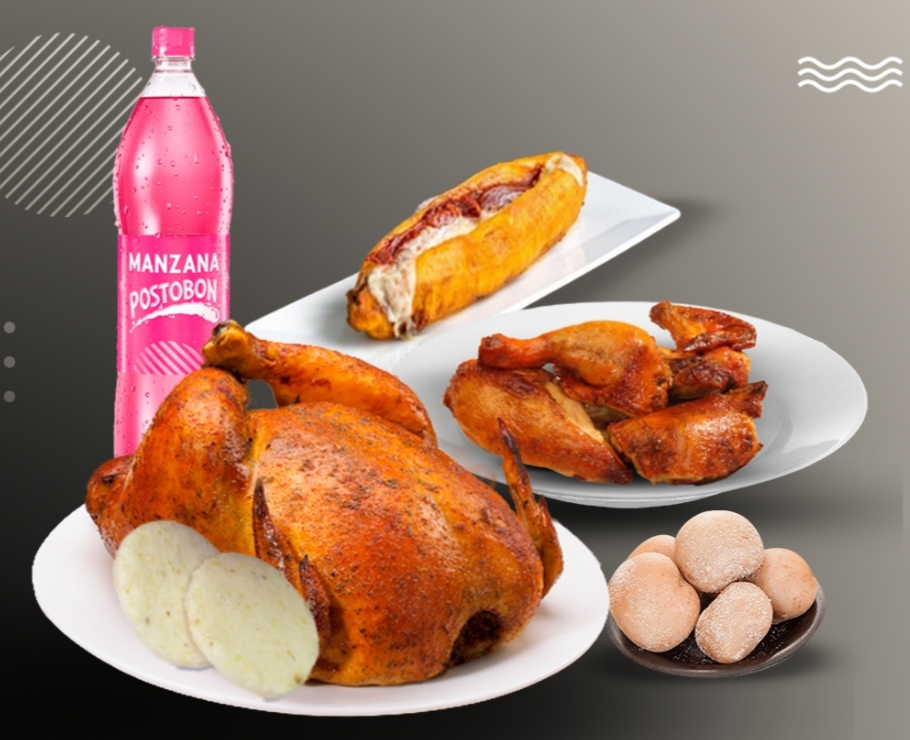 1 Pollo combinado: Medio Pollo Asado y Medio Pollo Broaster acompañado de Papas Cocidas, Papas a la Francesa, Croquetas de Yucas, Porción Arepas, y Gaseosa Postobón 1.5 L