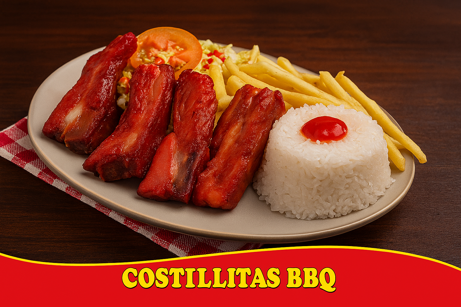 Costillas en salsa BBQ acompañadas de Arroz blanco, papas a la francesa y ensalada.