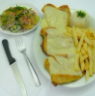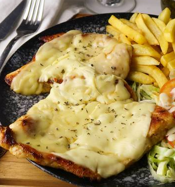 Pechuga gratinada, papa francesa y ensalada.