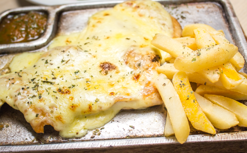 Pechuga gratinada, papa francesa, arroz blanco y ensalada.