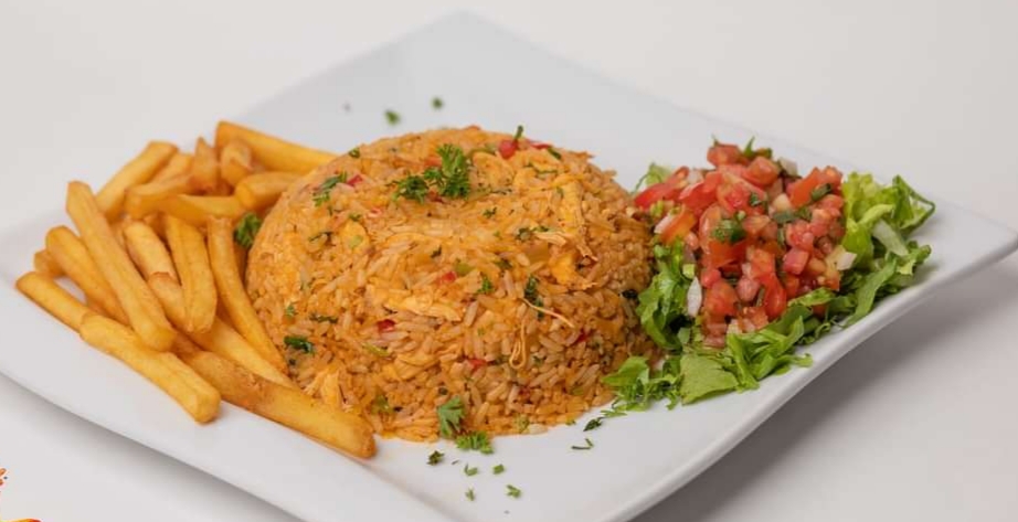 Arroz con pollo, papa a la francesa y ensalada.