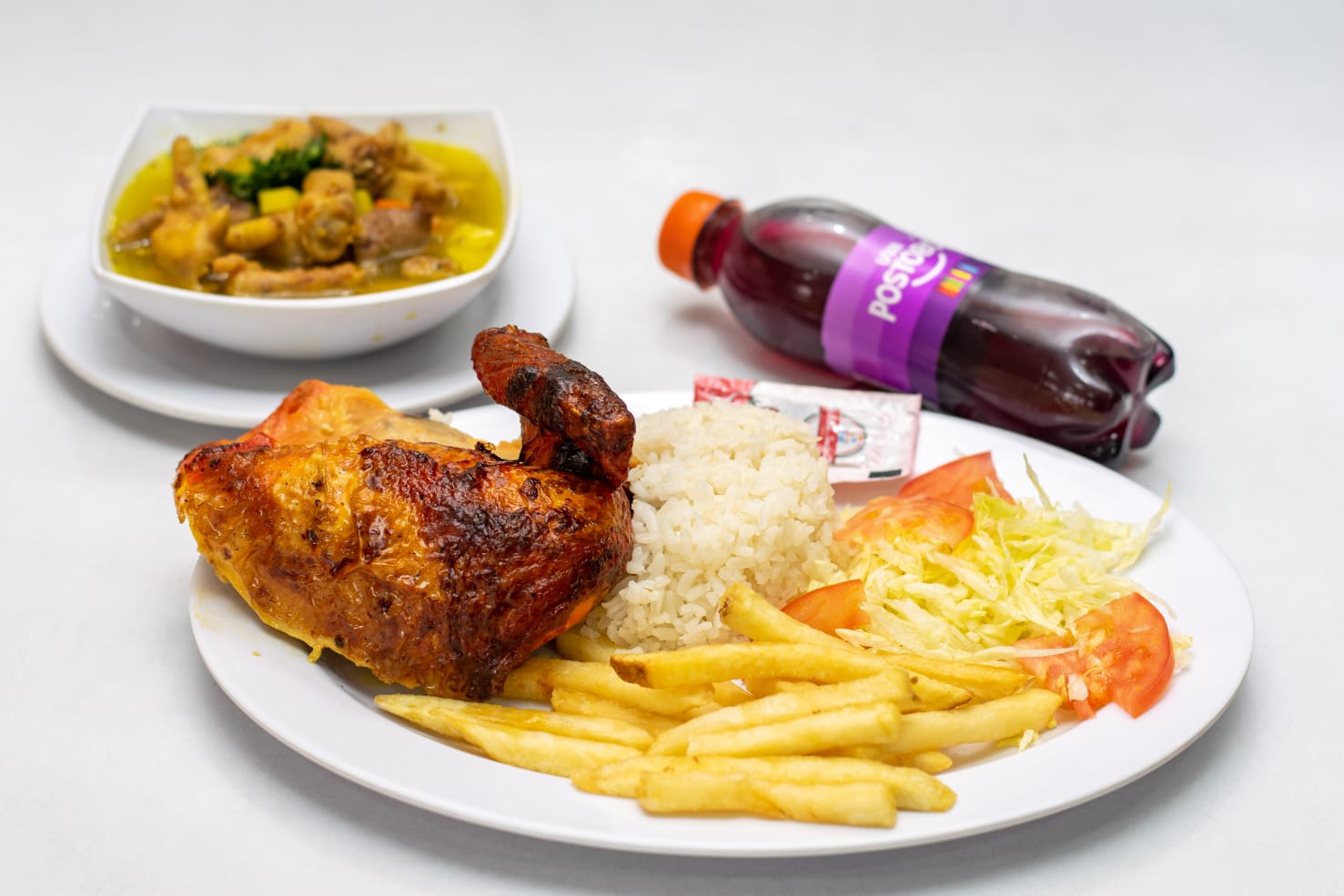 Pollo Asado + Papa salada + arepa + Plátano Maduro + Gaseosa 1 lt