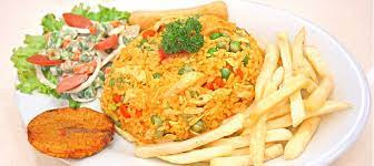 Arroz, ensalada (lechuga, tomate, zanahoria, cebolla), papa francesa, yuca y patacón.