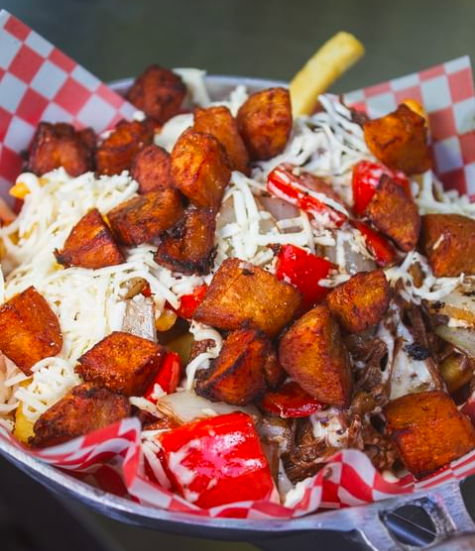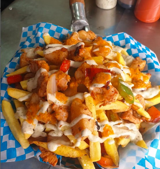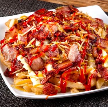 Platillo para dos personas, aprox. 500 g en total y 400 g de papas a la francesa, acompañado de salchicha tipo americana, pollo desmechado (60 g), tocineta, jamón, maíz tierno, huevo frito, queso mozzarella rallado y salsas a elección: tomate, piña, rosada, BBQ, mostaza o mayonesa.