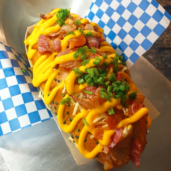 Pan artesanal con salchicha tipo americana, jamón, pollo desmechado, queso, papa chips, cebolla y salsas a elección.