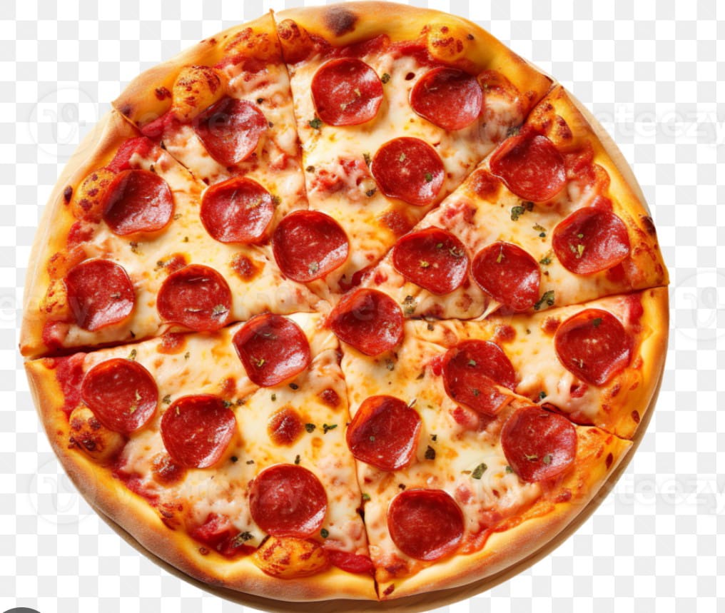 Pizza 8 porciones con base en salsa de tomate, queso y pepperoni