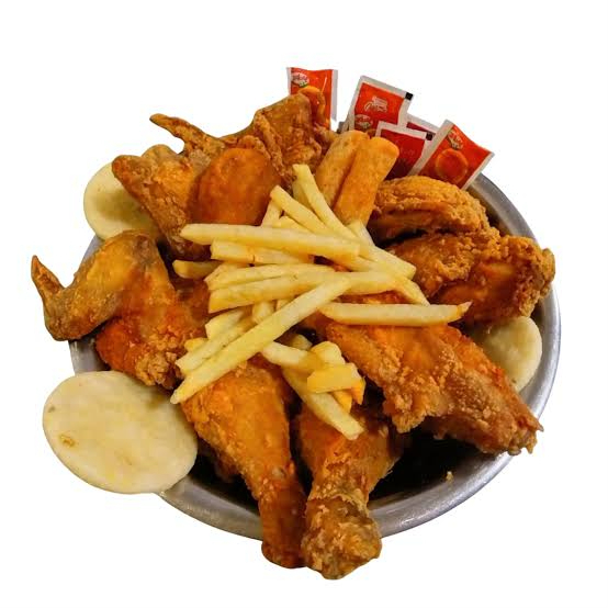 Salchicha long de casa, papa a la francesa, pollo con champiñones, queso.