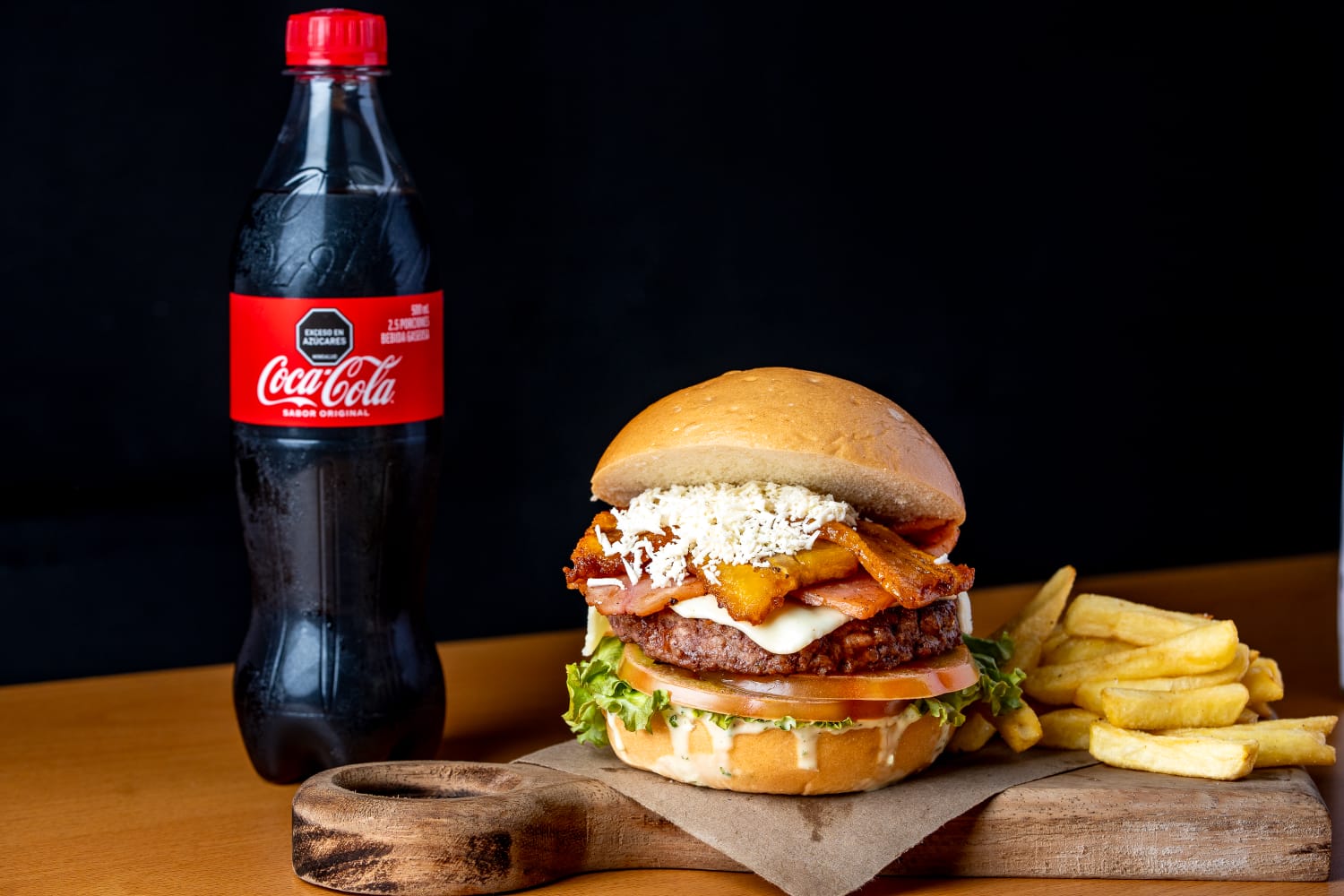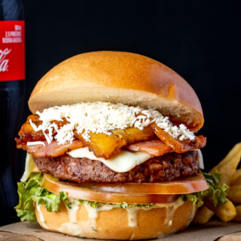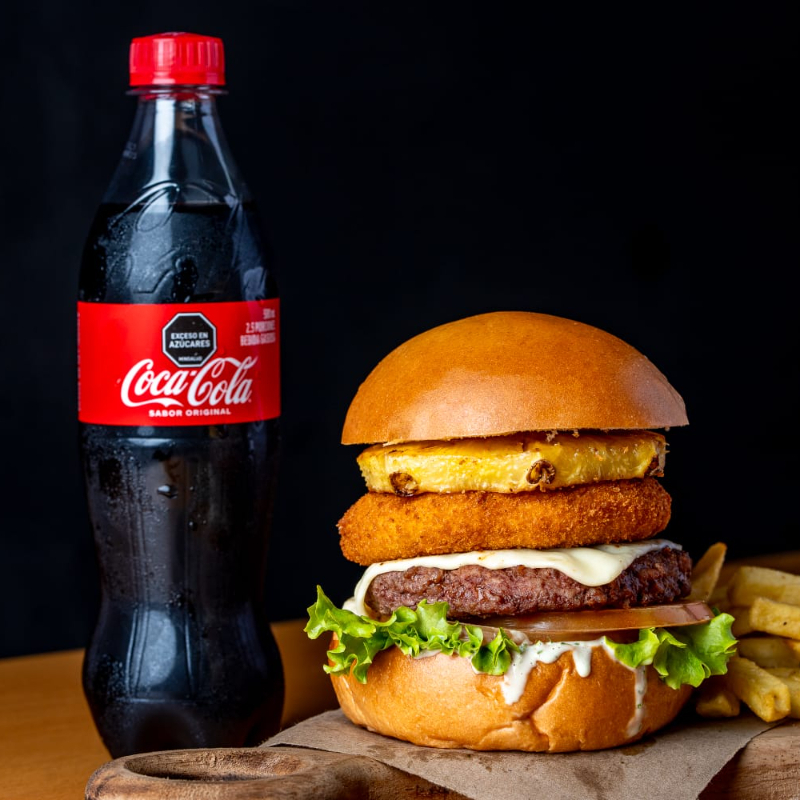 Hamburguesa de res premium, 120 g, acompañada de queso frito, piña asada, vegetales frescos, tocineta ahumada, pan de la casa, papas a la francesa y gaseosa 250 ml.