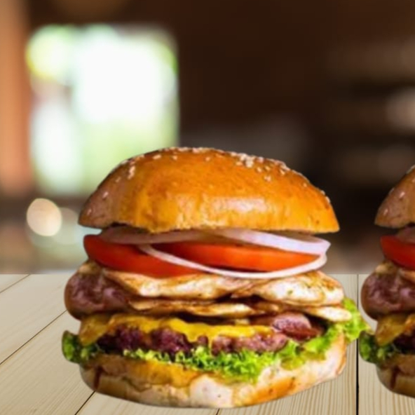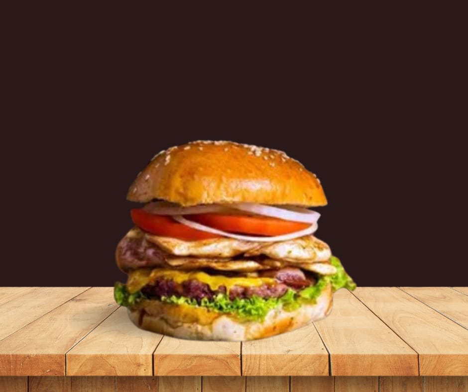 Hamburguesa de res 100 g con queso, tocineta, huevo frito, vegetales frescos, pan artesanal, y salsa de la casa.