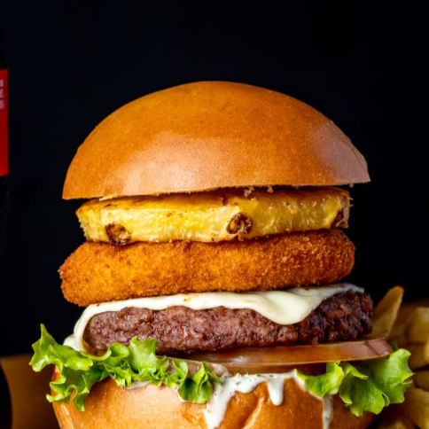 Hamburguesa de res con queso, tocineta, piña asada, vegetales frescos, pan artesanal y salsa de la casa.