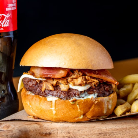 120 Gramos de carne de res, queso doble crema, tocineta, cebolla crispy, pan brioche, papas a la francesa y gaseosa 250 ml.