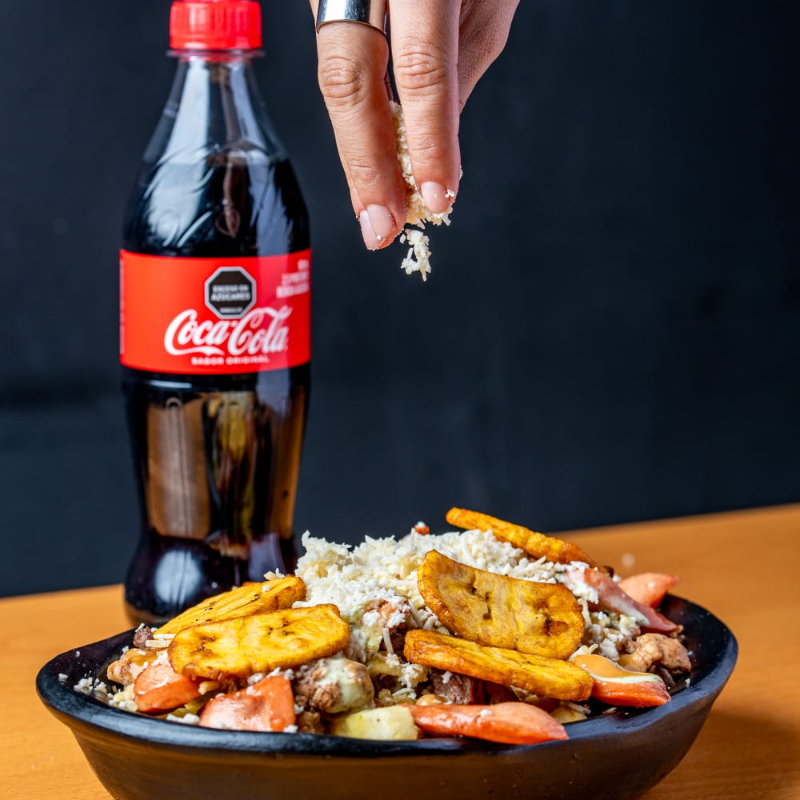 Papa francesa, carne, pollo salteado, maíz tierno, salchicha ideal, maduro frito, salsa de la casa, cabello de ángel, queso costeño y gaseosa 250 ml elige tu sabor favorito Pepsi, Colombiana, manzana.