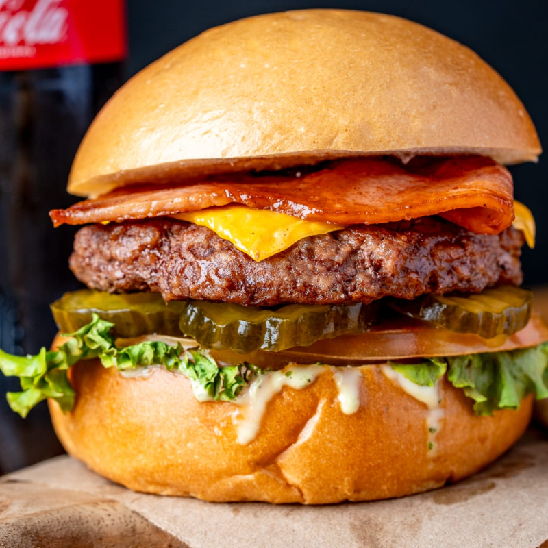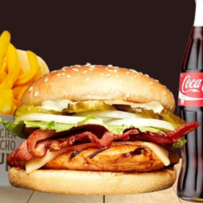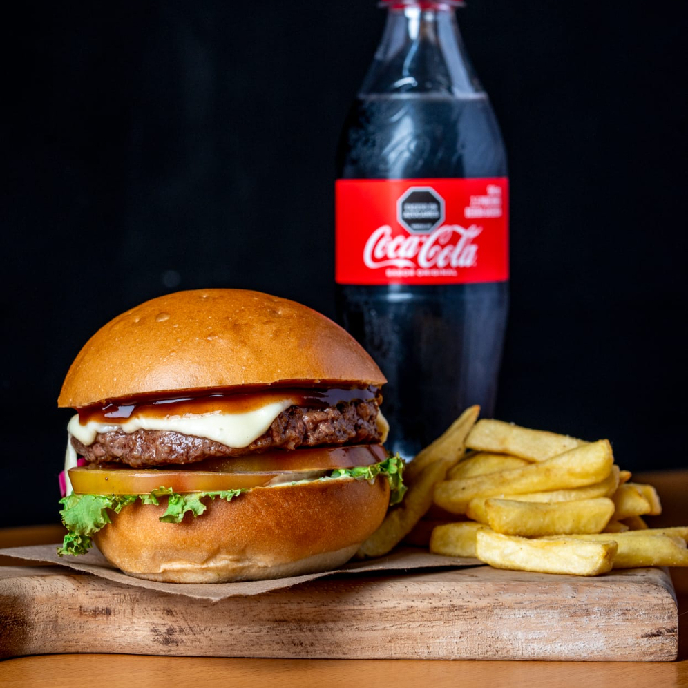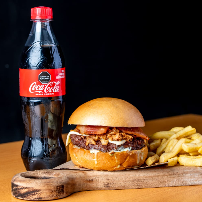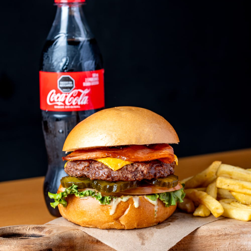 Carne de res 120 g, con queso americano, pepinillos, tocineta, vegetales frescos, pan brioche, acompañado de papas a la francesa y gaseosa 250 ml.