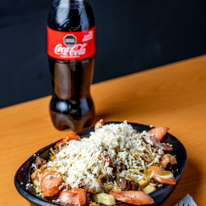 Papa francesa, carne, pollo salteado, maíz tierno, salchicha ideal, maduro frito, salsa de la casa, cabello de ángel, y queso costeño.