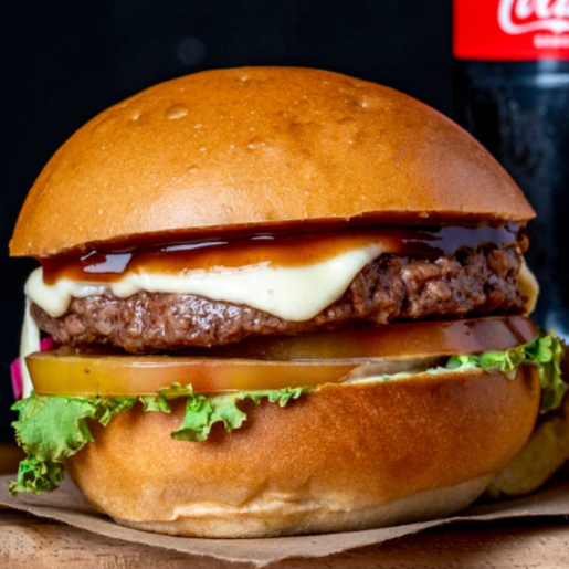 Hamburguesa de res con queso, cebolla crocante, tocineta, pan artesanal, y salsa de la casa.