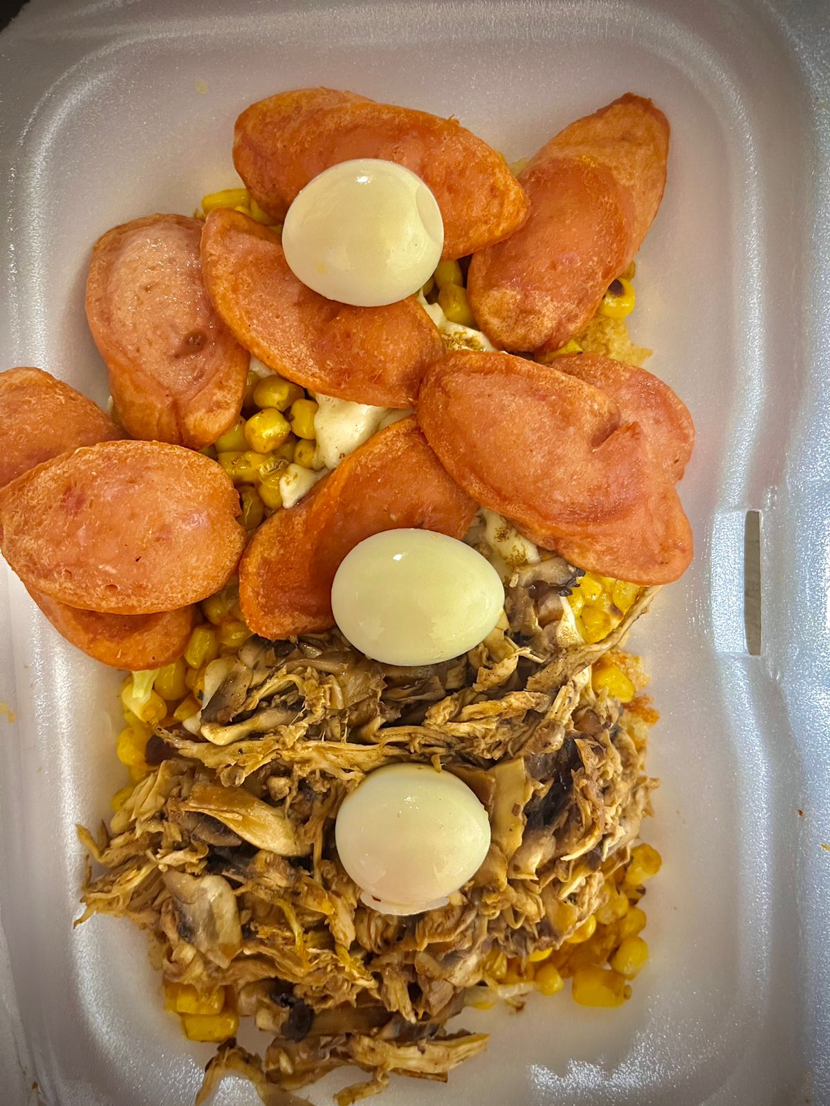 Papas chips, mazorca, pollo, champiñón, salchicha americana, queso gratinado y 3 huevos de codorniz.
