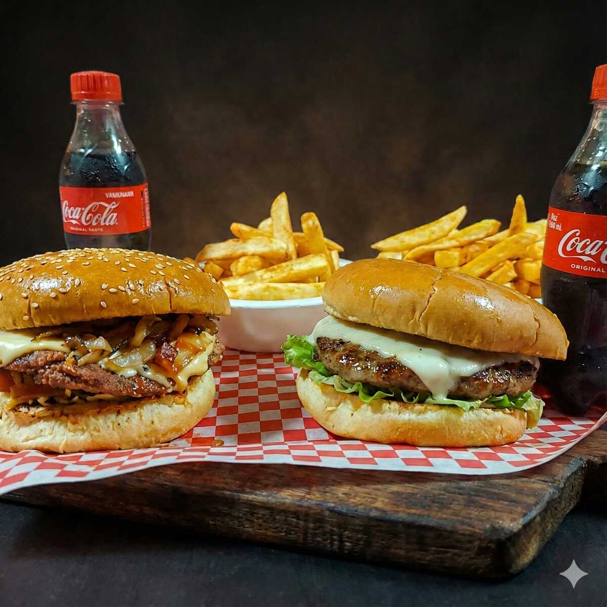 2 hamburguesas con carne jamonada, papa chip , lechuga, cebolla,queso , 2 porciones de papa ala francesa, 2 gaseosas 250 ml sabor a disponibilidad de la tienda.
