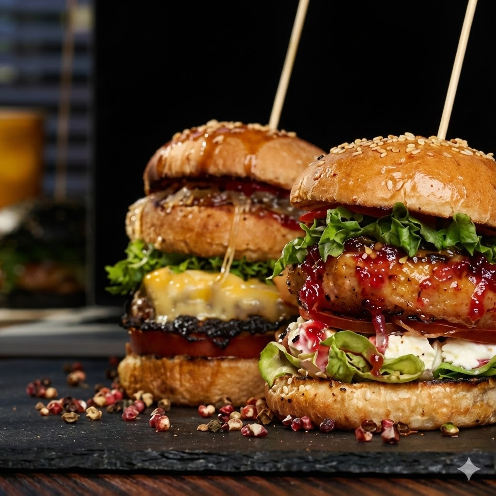Hamburguesa con 2 carnes, semi artesanal de res dos quesos, pollo con champiñón, mazorca tocineta, carne desmechada, lechuga, cebolla, papas chips, salsa de la casa rosada, tomate y huevos de codorniz.