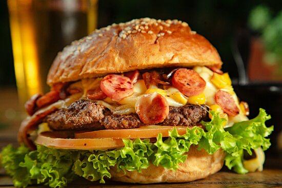 Hamburguesa con 2 carnes, dos quesos, pollo con champiñón, mazorca, tocineta, carne desmechada, lechuga, cebolla, papas chips, salsas la casa.