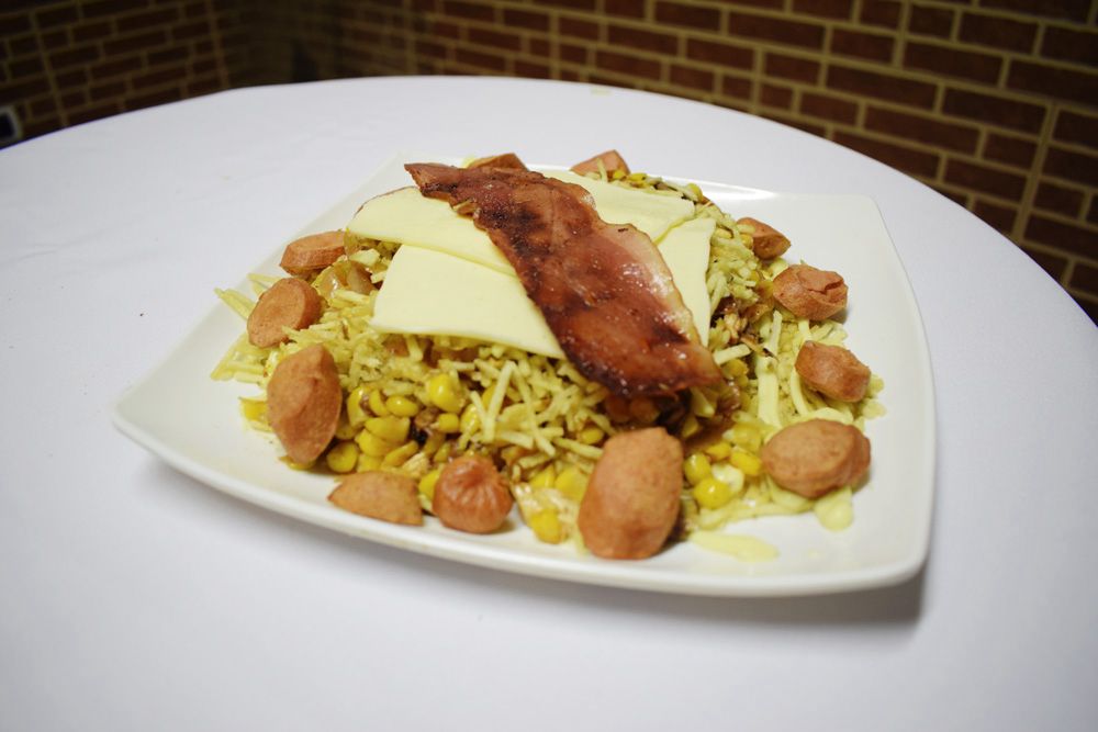 Salchicha americana, papa a la francesa, queso gratinado, tocineta, mazorca, pollo, champiñones y salsas de la casa.