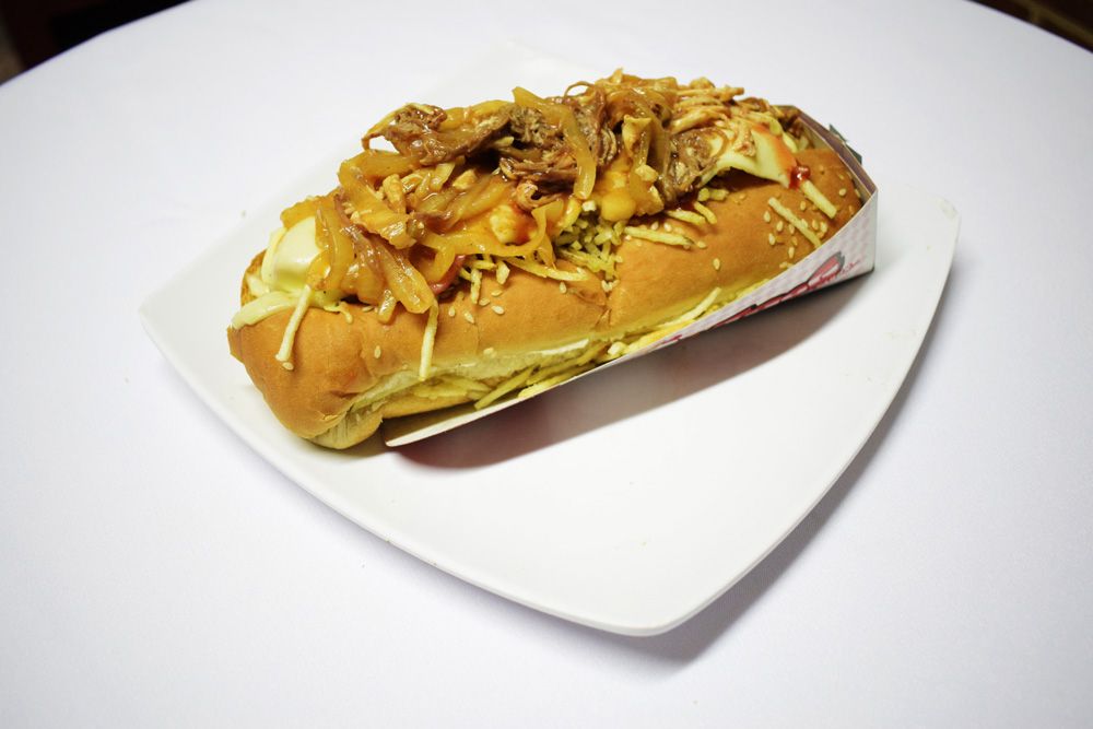 Perro caliente con salchicha americana, cebolla, papas chips, queso, salsas de la casa, carne desmechada, pollo desmechado.