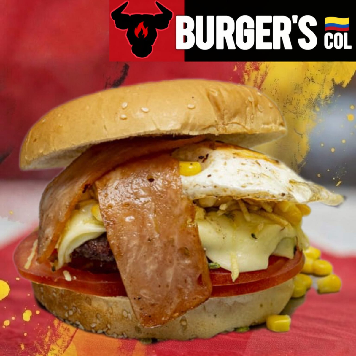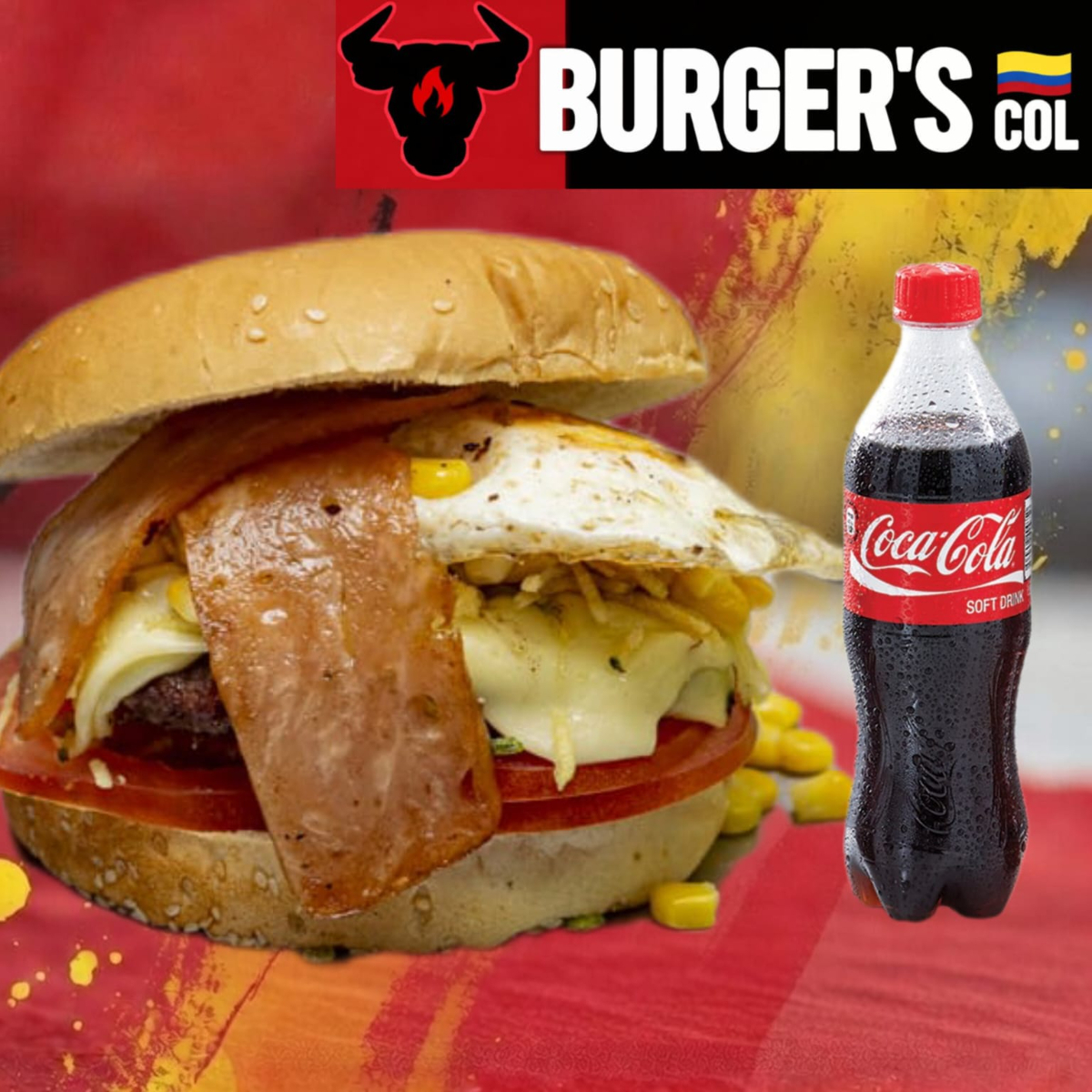 Carne de res 100% artesanal,huevo,queso,tocineta,maiz,vegetales + gaseosa(Disponible)