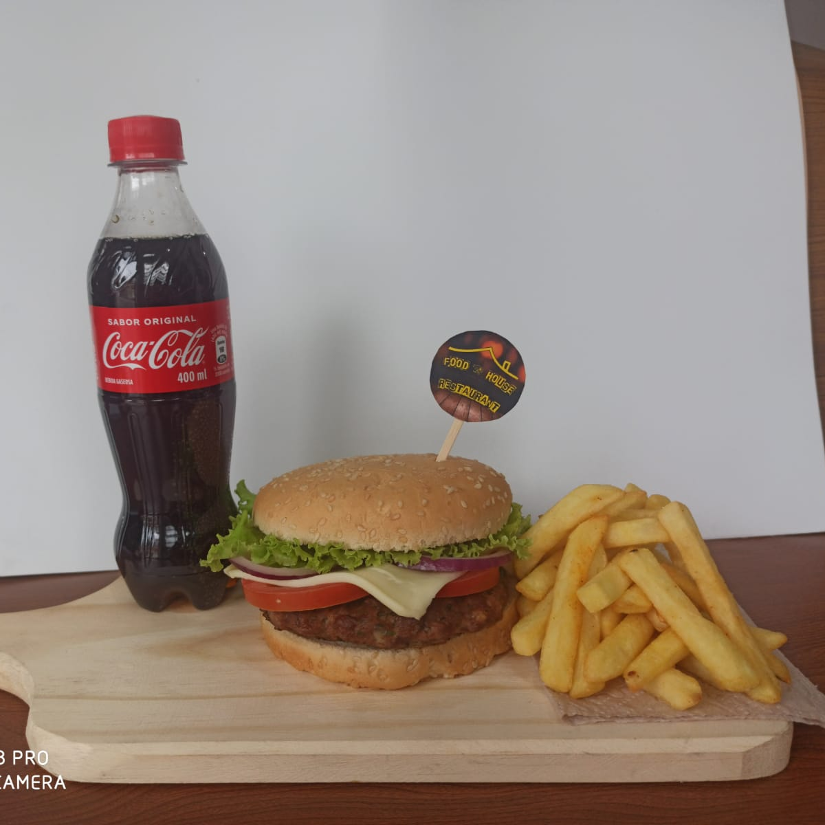hamburgues de carne de res con doble porcion de jamon vegetales papa fosforito y salsas de la casa + papas francesas + gaseosa postobom de 400 ml