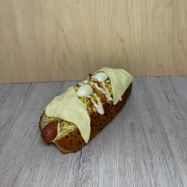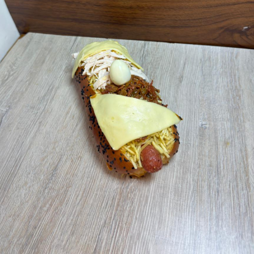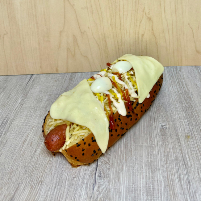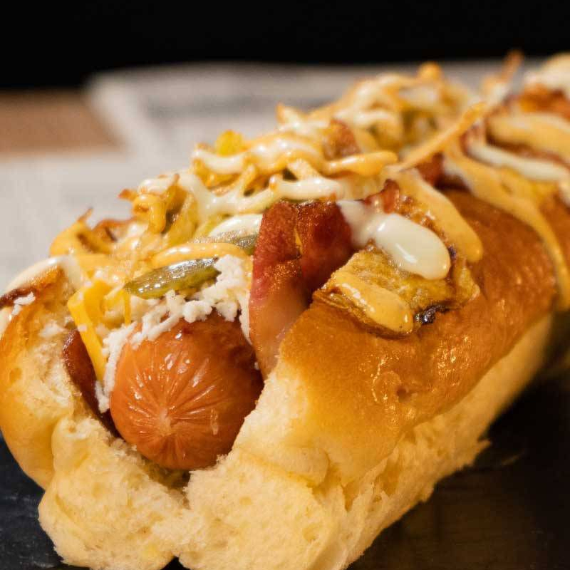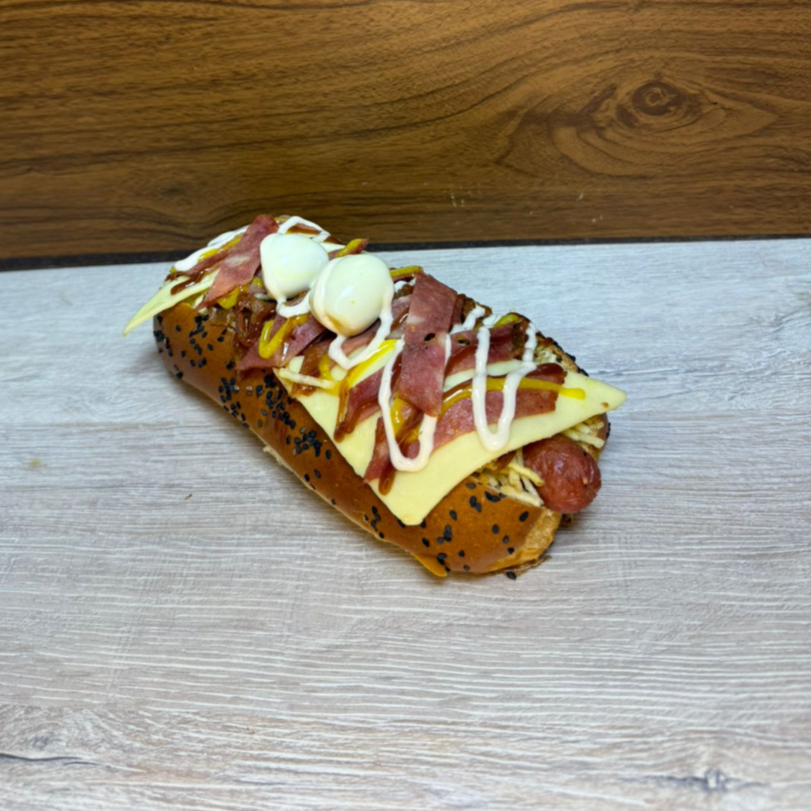Contiene salchicha americana, carne desmechada, pan con ajonjolí, papa fosforito, doble queso doble crema, 3 huevos de codorniz, tocineta, salsas (tomate, mayonesa, BBQ, ranch, mostaza, ajo).