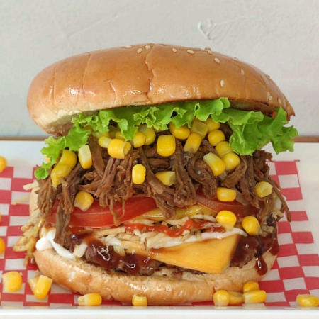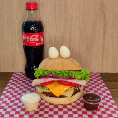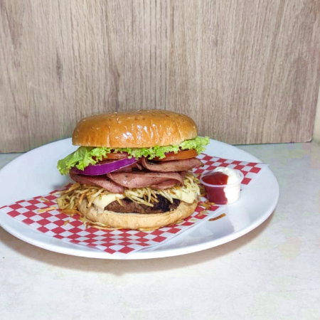 Contiene 150 g de carne de res, doble jamón ahumado, queso tipo mozzarella, tomate, cebolla, lechuga, salsas (tomate, mayonesa, BBQ, ranch, mostaza, ajo).