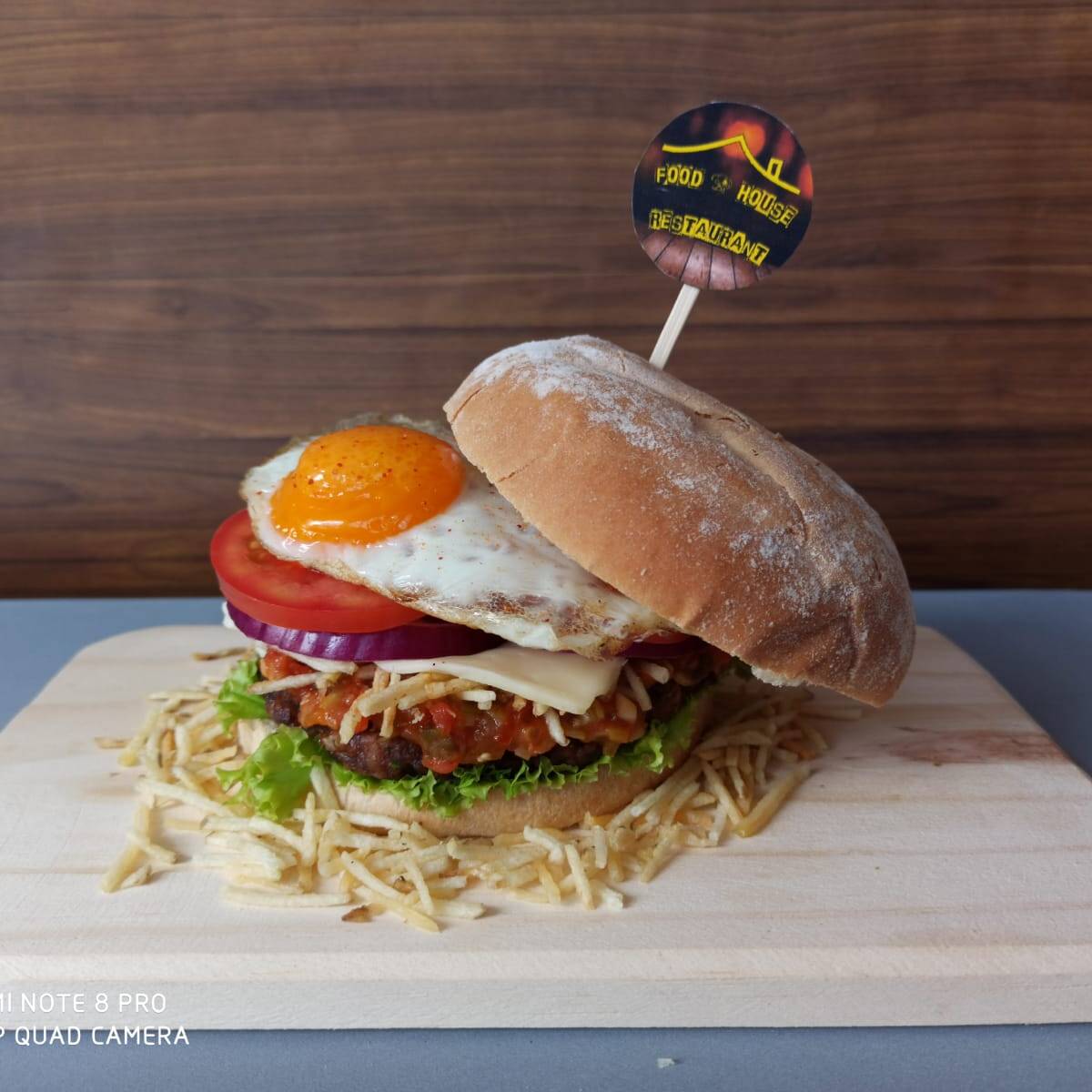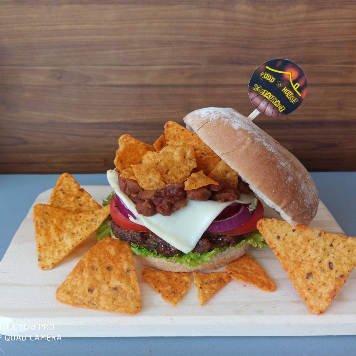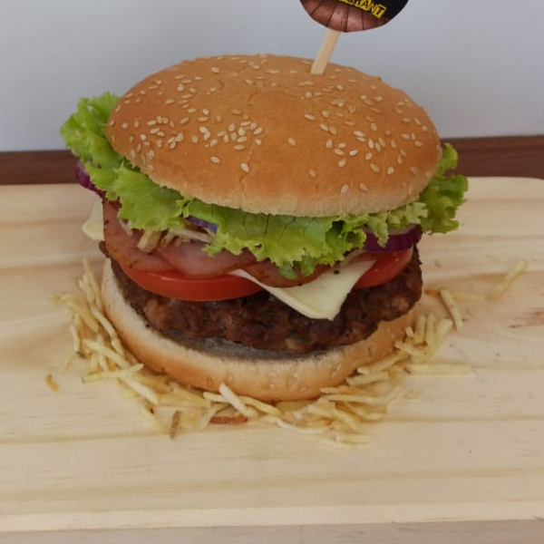 Hamburguesa con 130gr de res, queso mozzarella, 100gr de pollo , vegetales y salsa de la casa