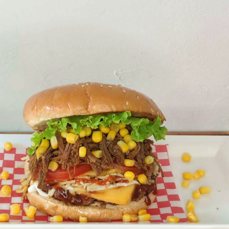 Hamburguesa: contiene aprox. 170 g de carne de res desmechada, mazorca desgranada, hogao, papa fosforito, tomate, cebolla, lechuga, queso mozzarella y salsas (tomate, mayonesa, BBQ, ranch, mostaza, ajo). Todos los ingredientes vienen preparados.