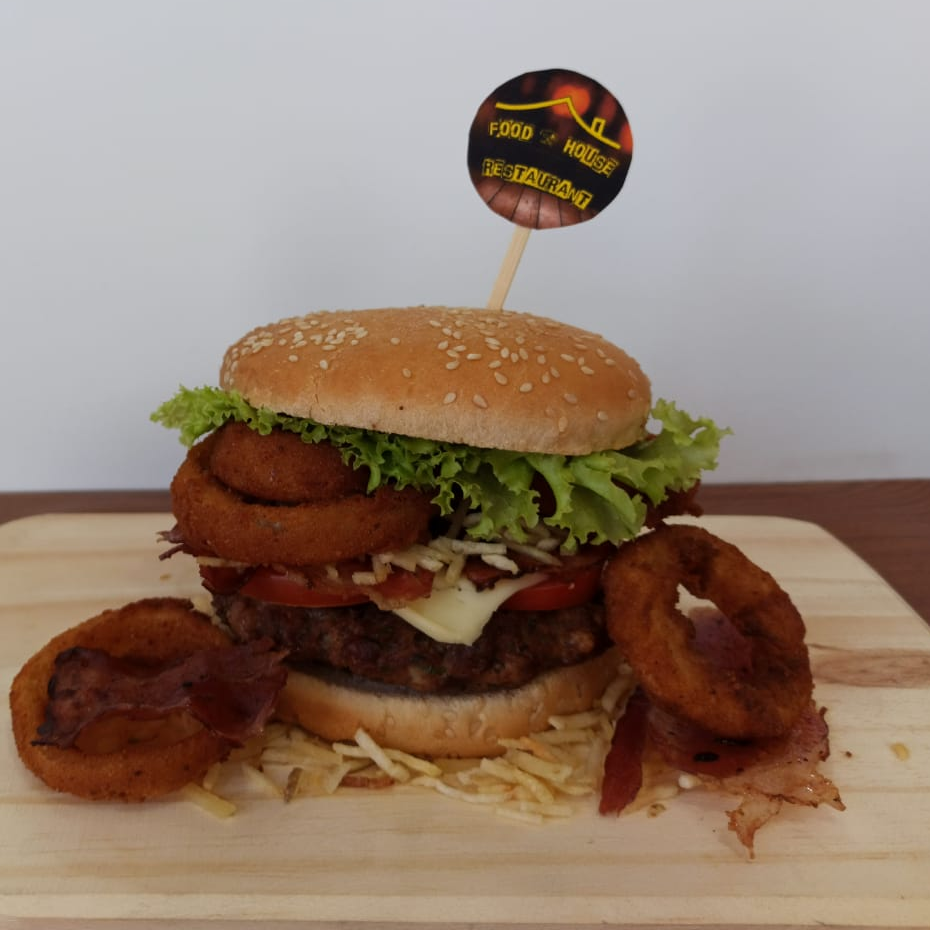 Contiene 170 g de carne de res, doble de tocineta, aros de cebolla, tomate, lechuga, queso tipo mozzarella, papa cabello de ángel, salsas (tomate, mayonesa, BBQ, ranch, mostaza, ajo).