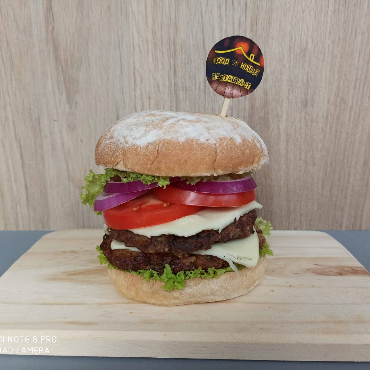Hamburguesa con doble carne y doble queso mozzarella mas vegetales y salsas de la casa