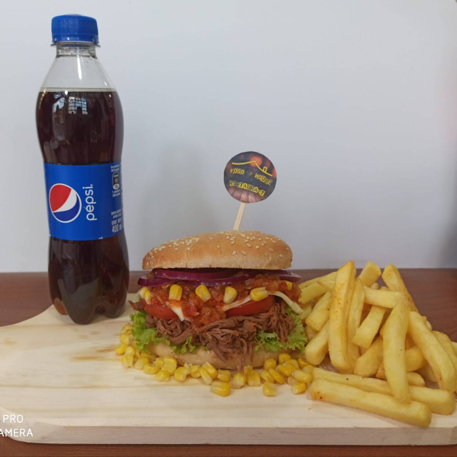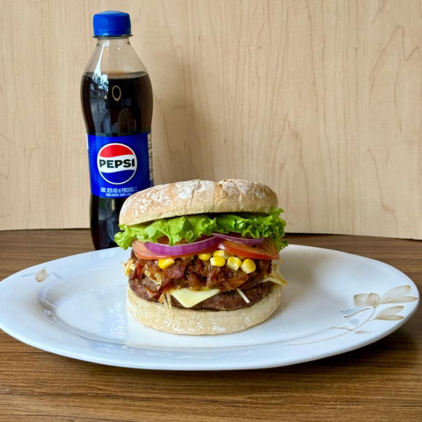 hamburguesa de carne desmechada en haogado + carne de res artesanal maiz , vegetales salsas de a casa + papas francesa y gaseosa a elegir