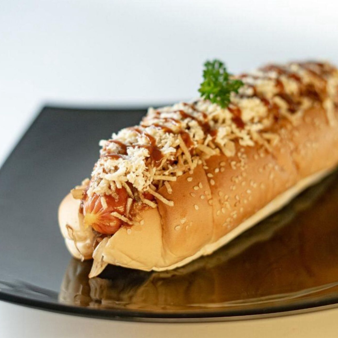 Contiene salchicha americana, pan con ajonjolí, papa fosforito, queso doble crema, huevo de codorniz, salsas (tomate, mayonesa, BBQ, ranch, mostaza, ajo).
