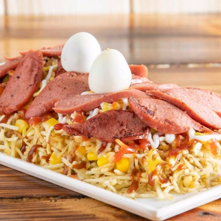 Finos cortes de chorizo, salchicha zenu, maiz desgranado,queso doble crema , papa cabello de angel, 2 huevos de codorniz,y salsa de la casa