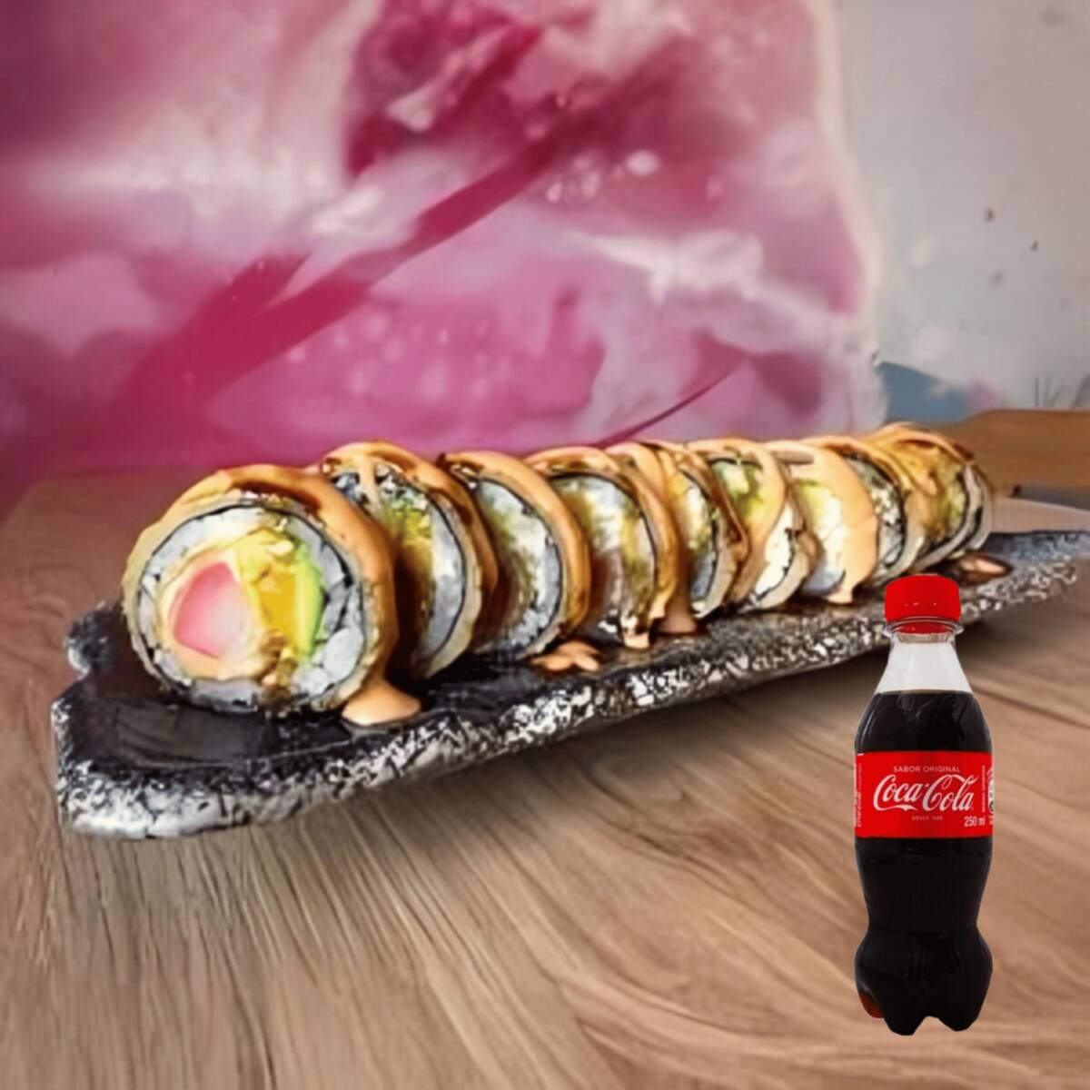 Arroz de sushi, rellena de queso crema, aguacate cremoso, ensalada dinamita de cangrejo, aderezada con mayonesa japonesa, acompañada con salsa teriyaki + coca cola 250ml