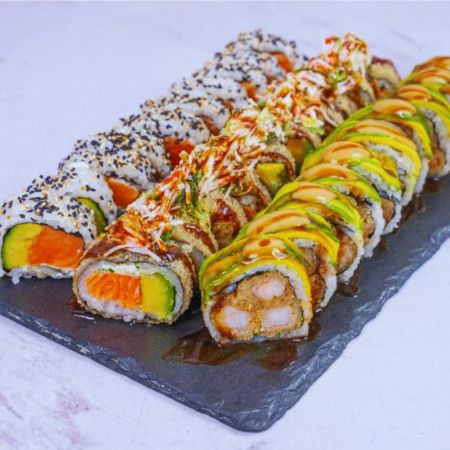 30 piezas de sushi, 10 piezas de alaska roll, con salmón, queso crema, topping de aguacate, salmón, wakame y masago, 10 piezas tiger especial y 10 piezas agu roll langostinos crocantes, cebollina, queso crema con toping de aguacate, bañado en salsa fuji y teriyaki.