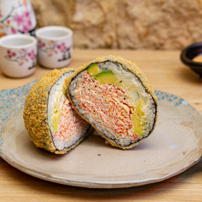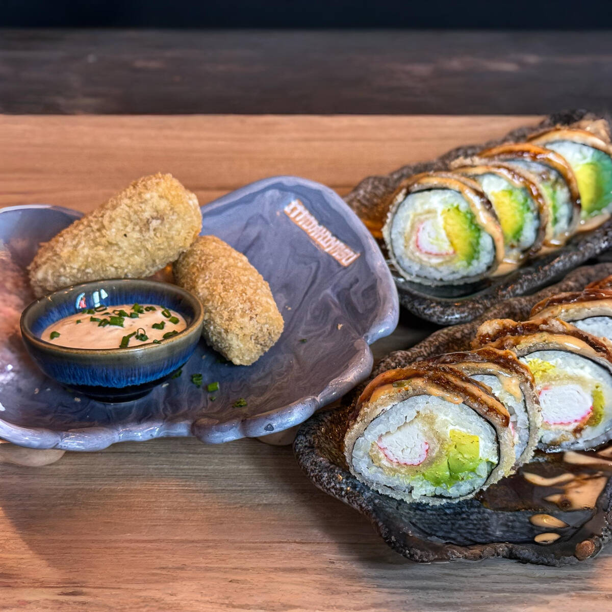 Arroz de sushi, rellena de queso crema, aguacate cremoso, ensalada dinamita de cangrejo aderezada con mayonesa japonesa. acompañada con salsa teriyaki.