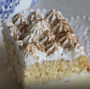 Es un ponqué, remojada en una mezcla de 3 leches diferentes decorado con crema chatilly.