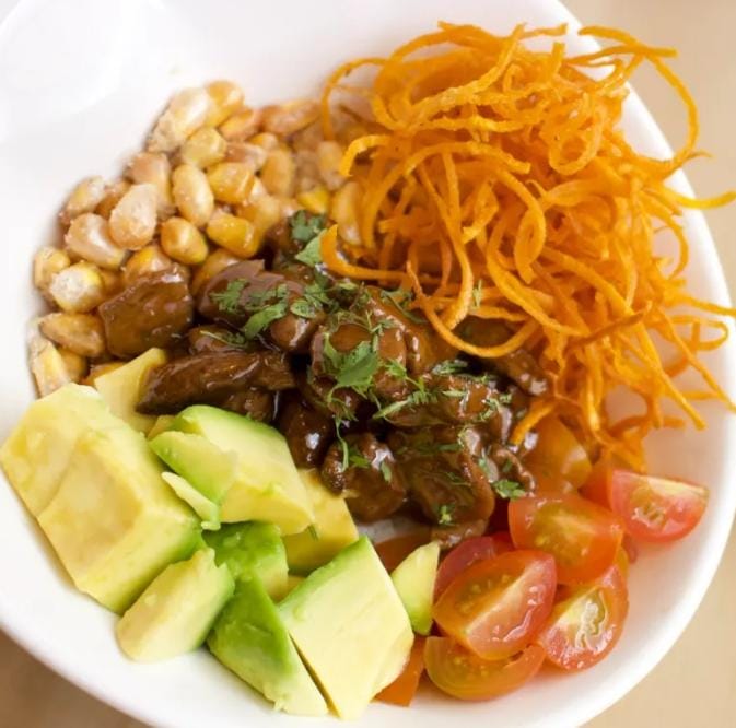 Base de arroz blanco, lomo en juliana, tomate cherry, chips de plátano, maíz cacha y aguacate.
