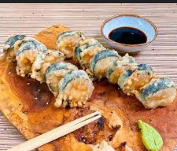 Palmito tempura, queso crema, aguacate con topping de camarones picados con dinamita y cebollín.